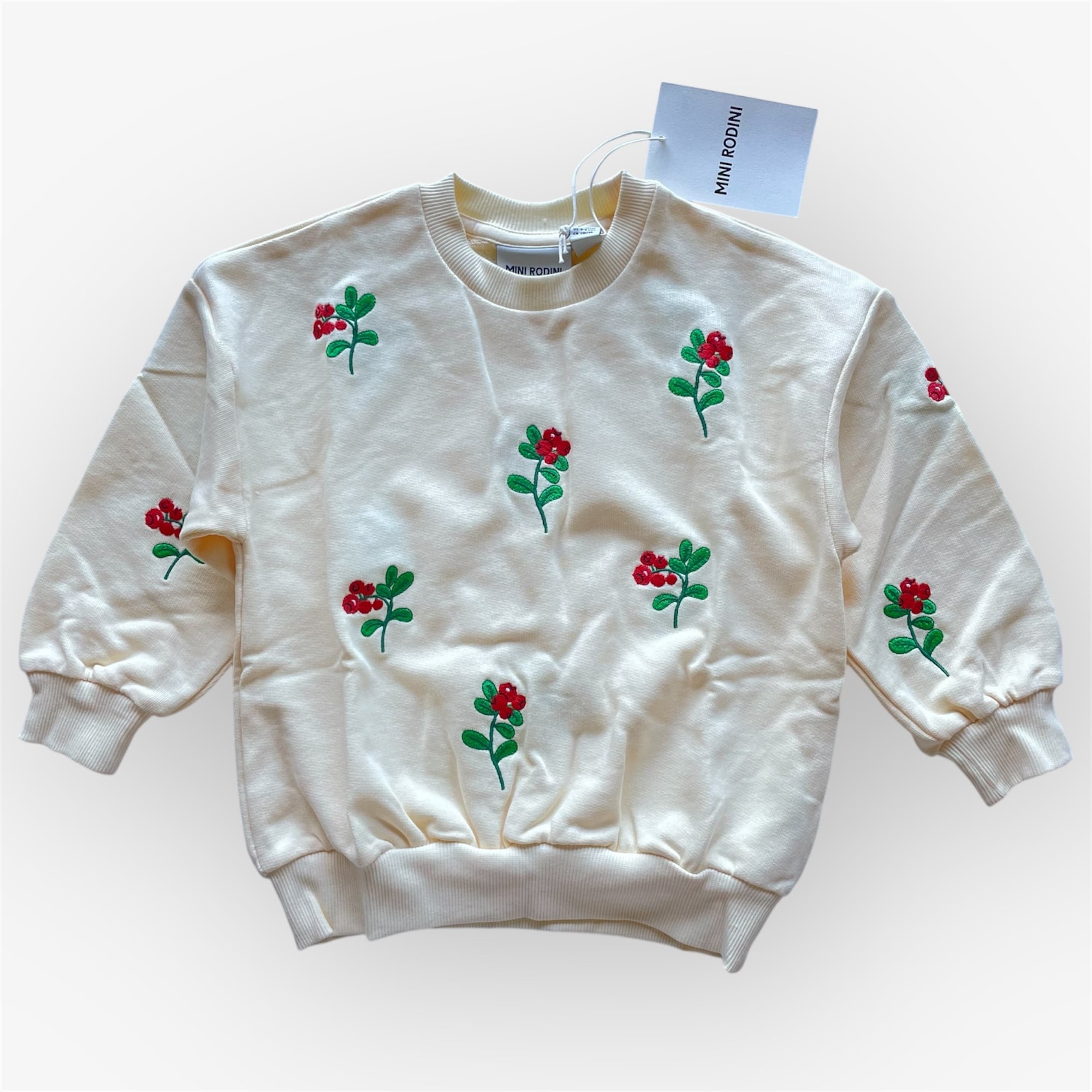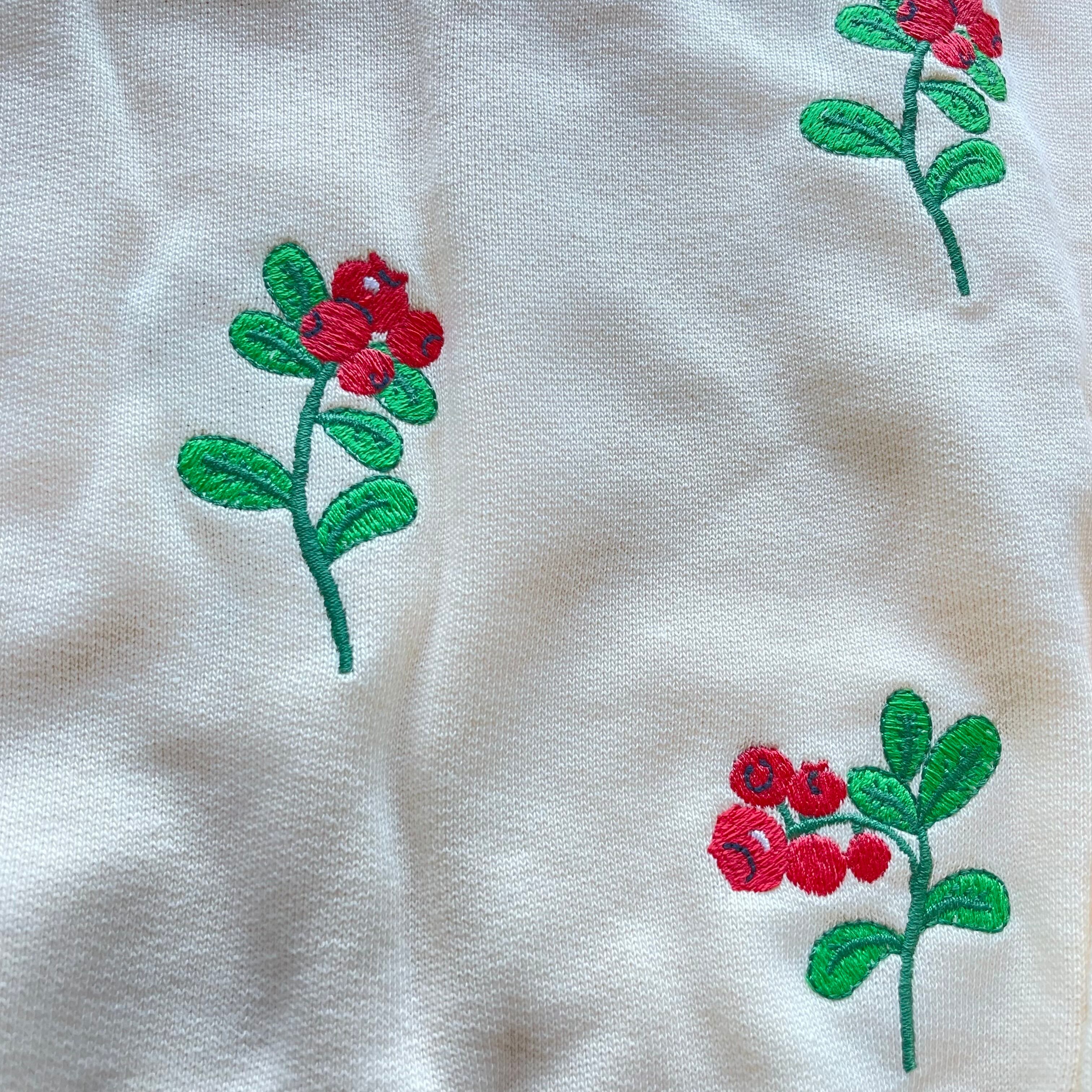 可愛らしいリンゴンベリー刺繍が魅力のスウェットシャツ。お子様のファッションに個性を加え、着ることで楽しい気分を演出してくれます!オーガニックコットンを使用したやわらかな素材感は、心地よい肌触りでお子様も安心して着用できます。