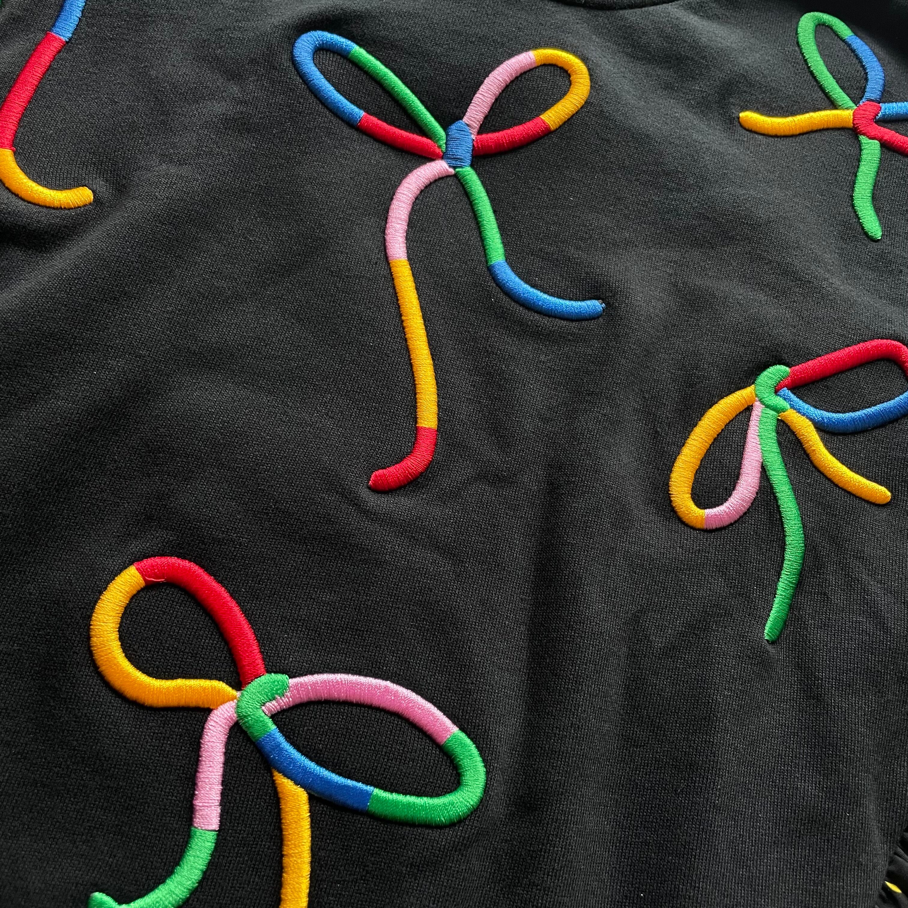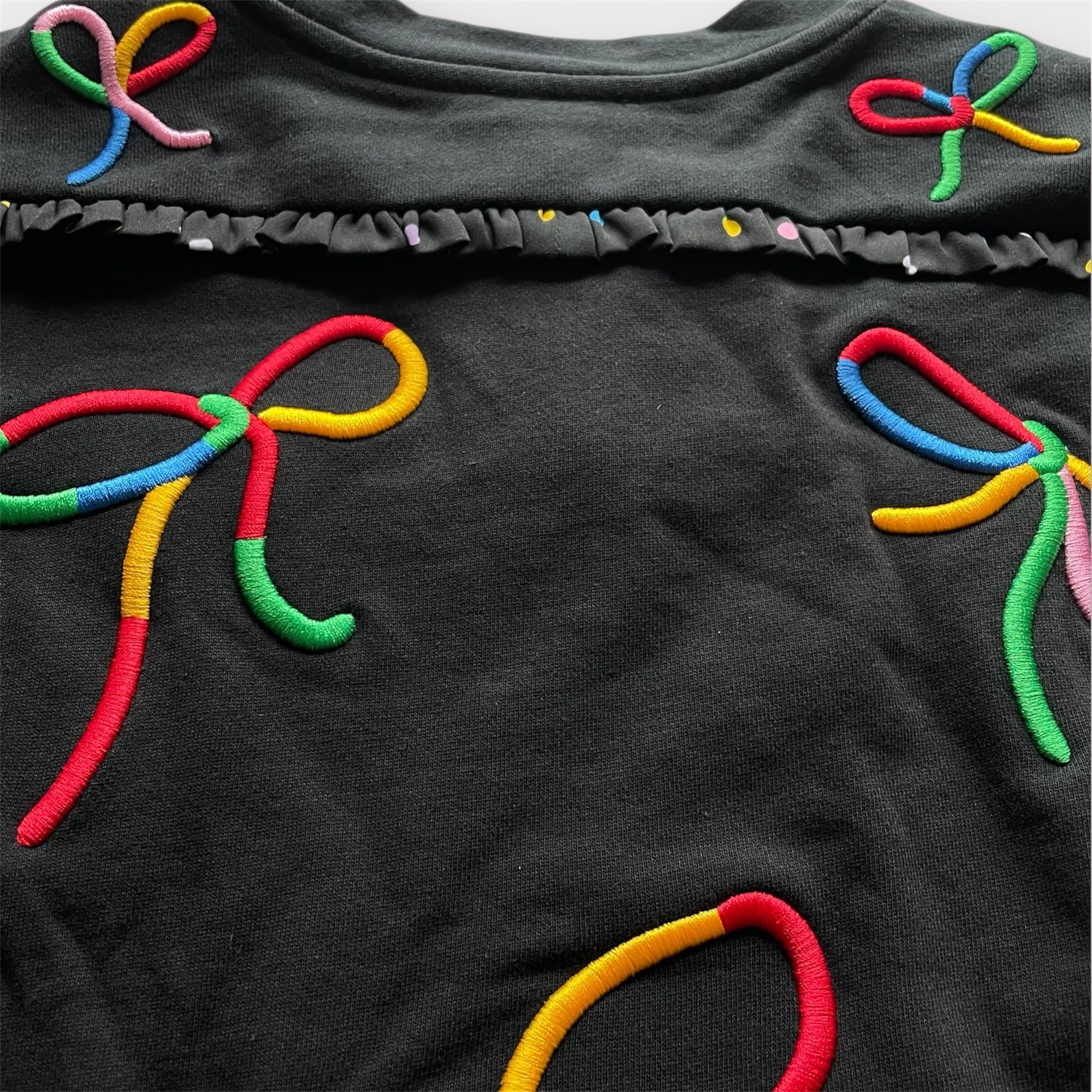 鮮やかなマルチカラーの刺繍リボンが施され、立体感が楽しめるデザインが魅力。フリル部分には水玉模様があしらわれており、細部までこだわり抜かれた最高に可愛い一着です。オーガニックコットンを使用した柔らかな素材感は、お子様の肌にも優しく、快適な着心地を提供します。
