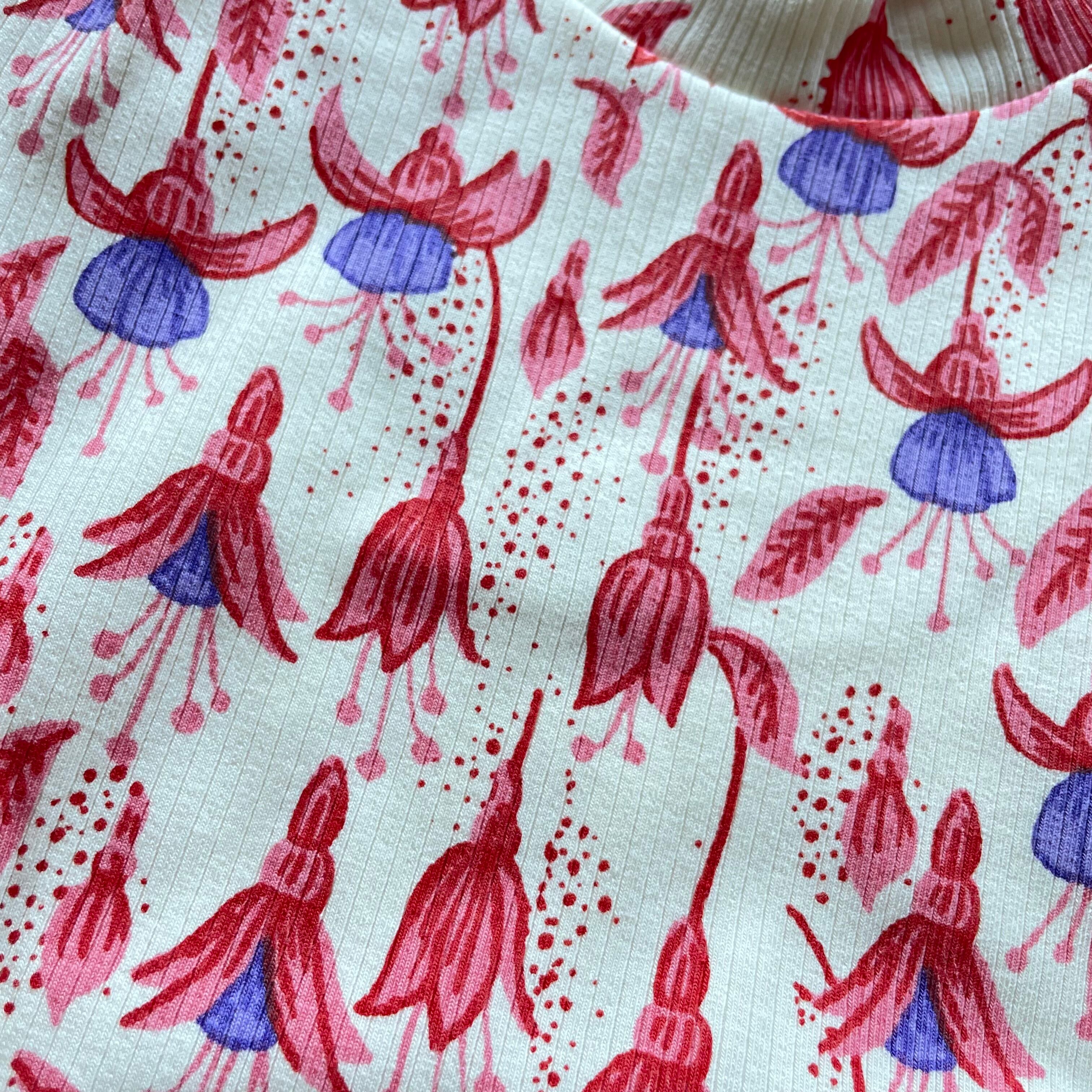 鮮やかなレッドカラーが印象的な長袖Tシャツ。「つつましい愛」や「おしゃれ」という花言葉のあるフクシアが全面にデザインされ、大人かわいいスタイルにぴったりです!オーガニックコットン素材でお子さまも安心して着用いただけます。普段使いから特別なイベントまで、幅広いシーンで大活躍するアイテムです。
