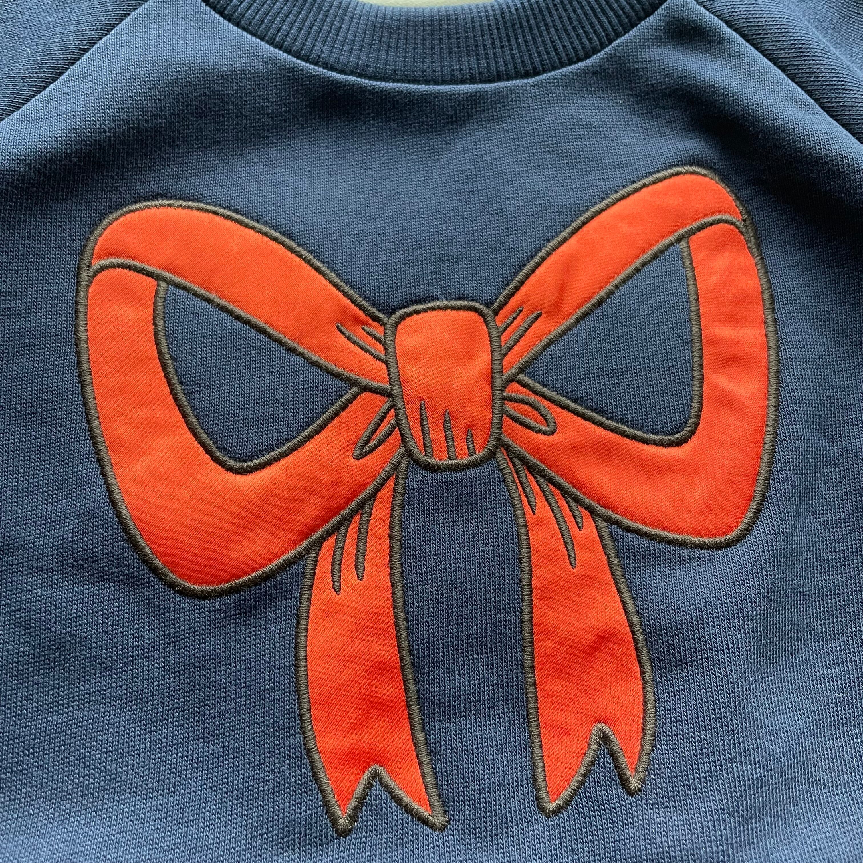 深みのあるネイビーに、ぷっくり立体的な赤いリボンがアクセントのトレーナー。シンプルなのに一枚でコーデが完成する、ミニロディーニらしい可愛さの一着です。GOTS認証のオーガニックコットンを使用しておりふんわり柔らかく、デイリー使いにぴったりの肌ざわりで、敏感肌の子にも安心です。